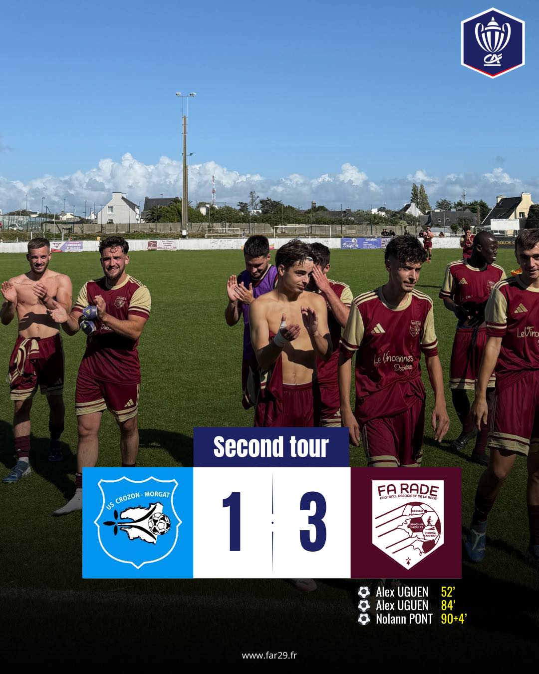 Si la première période fut compliquée, Crozon a profité des déchets techniques de nos joueurs pour ouvrir le score avant la pause. Derrière, les Grenats ont accéléré et monopolisé le ballon. Leurs efforts vont être récompensés par un joli coup franc d’Alex Uguen (52’, 1-1), qui ouvre là son compteur but depuis son grand retour au FAR. Celui-ci va même s’offrir un doublé dans les derniers instants pour donner l’avantage aux siens (84’, 1-2), avant que Nolann ne clôt le spectacle d’un but venu d’ailleurs sur un coup franc de 50m ! 💣